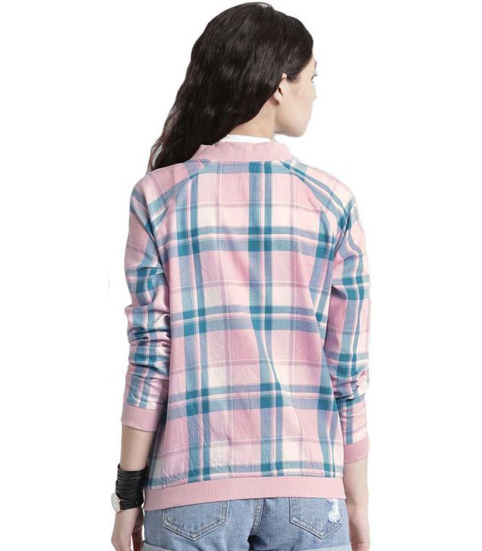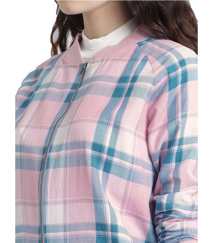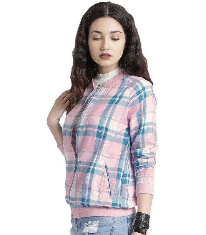 [vc_row][vc_column][vc_column_text]Pink and blue checked bomber, has a stand collar, 2 pockets, zip closure, long sleeves, straight hem. You’ll love the warmth and style of this pink jacket made by Roadster. Stay warm while heading out to the city with friends this weekend in this piece.[/vc_column_text][/vc_column][/vc_row]