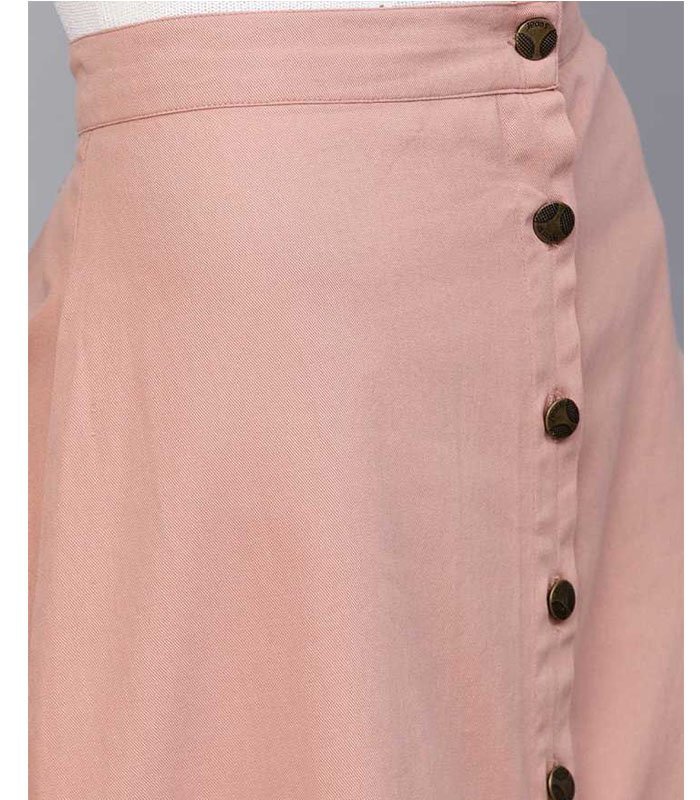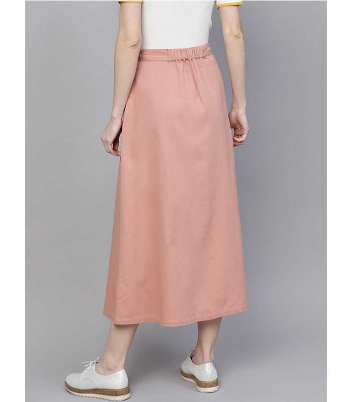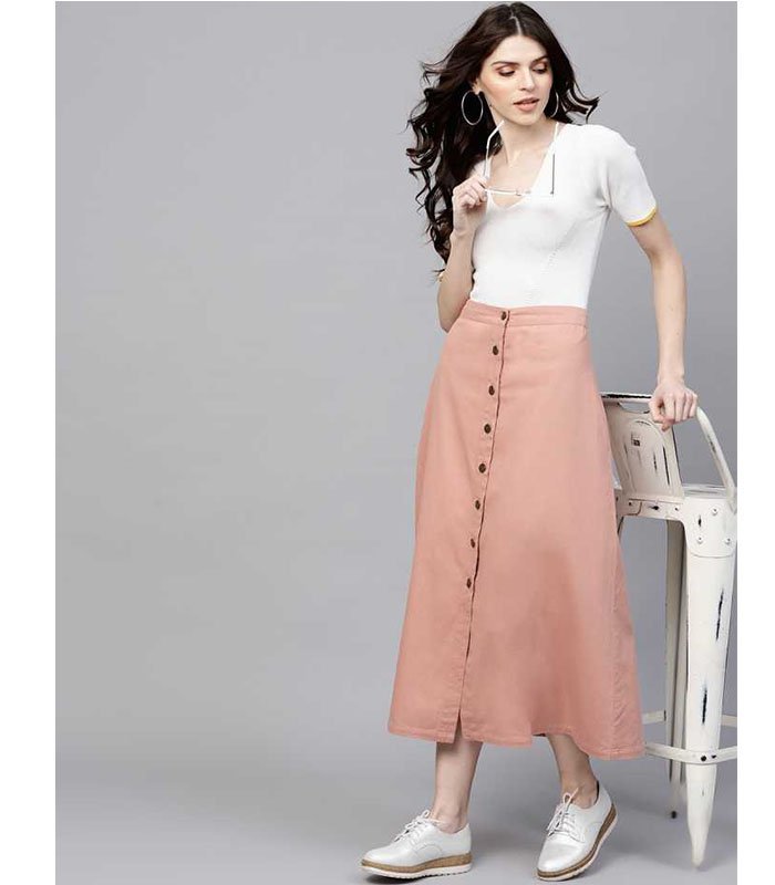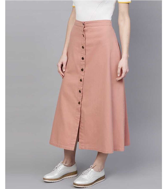 Pink Denim Longline Buttoned Skirt, in Denim fabric, Unlined, Calf Length, Fit and Flare, Button Closure, Straight Hemline and features Button Placket at Front